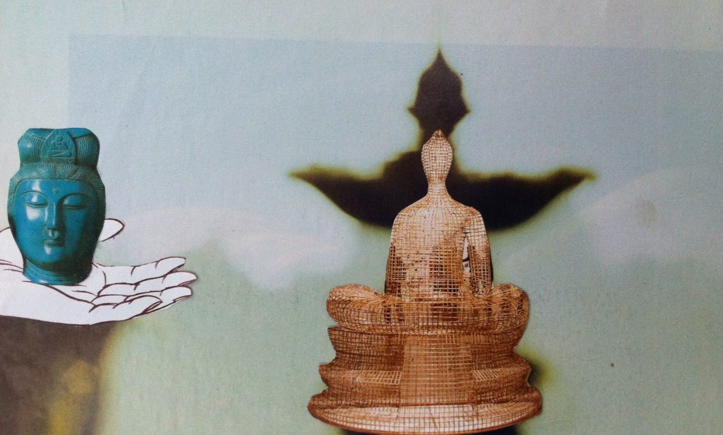 The first time my friend Mara* kissed her now boyfriend, she fainted and saw the hand of the Buddha. What did it all mean, she wondered? Well, it turns out it was a pretty good omen for love and happiness, and also the inspiration for today’s collage.