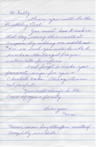 Sent in advance of my birthday, she thought a coupon for a frozen dinner (really Mom?) would get me out of cooking on that day.